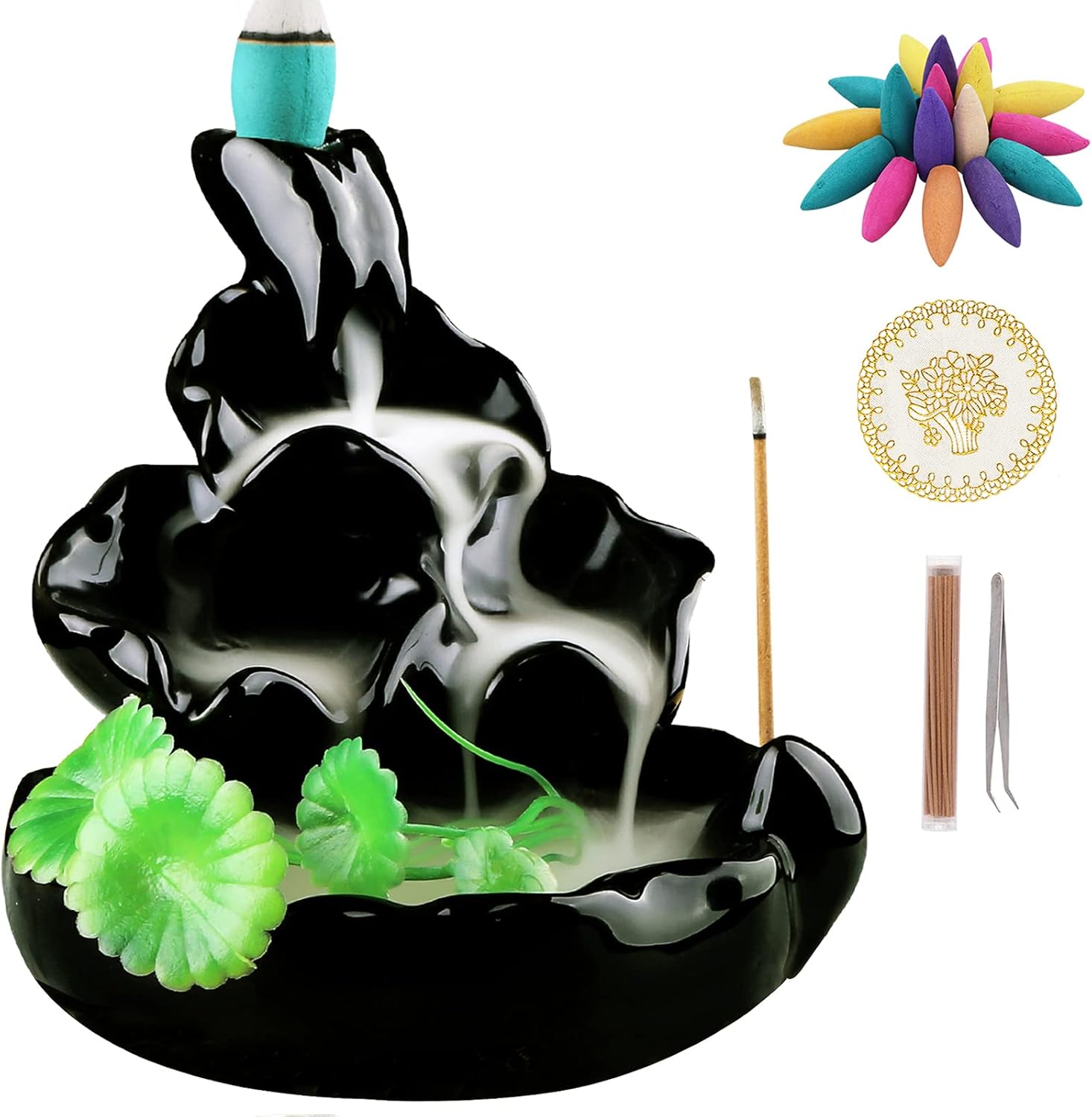 - Pack include: 1 burner, 40 cones, 40 incense sticks, 1 pad, 1 tweezers, 1 grass for decoration
